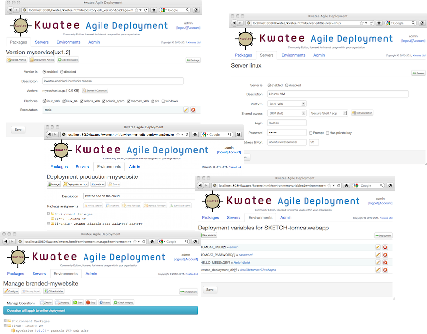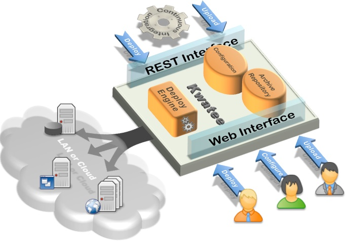 Kwatee Agile Deployment est un outil gratuit (à usage interne de développement) capable de déployer des applications web applications ou tout autres logiciels sur n'importe quel OS. Les opérations fastidieuses et propices aux erreurs de mise à jour sont automatisées et réalisées sur un nombre quelconque de serveurs dans vos locaux ou dans le cloud en quelques minutes.
