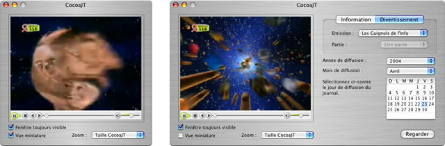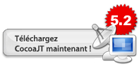 CocoaJT est une application pour Mac OS X vous permettant de voir en ligne les flux vidéos de différentes chaînes (actuellement 72 émissions sont disponibles). Vous pouvez ainsi accèder avec simplicité aux journaux de TF1, France2, France3, TV5, EuroNews, ...